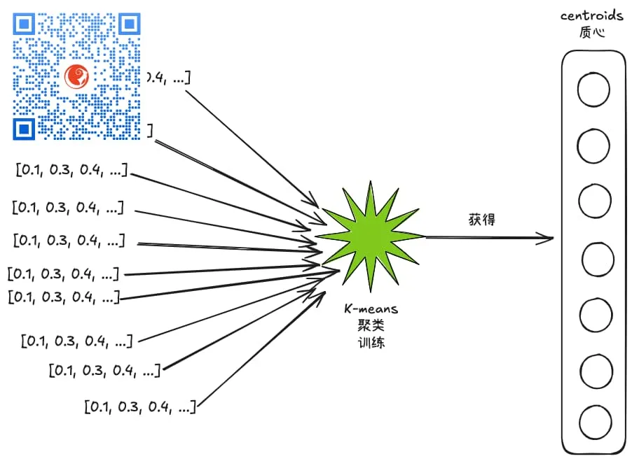 训练完成后,我们就获得了k个质心(centroids),这k个质心就相当于k个组的组长(也可以认为是k个桶的入口),后面在对向量进行索引或者查询的时候,都是基于这个训练后获得的k个质心进行的。