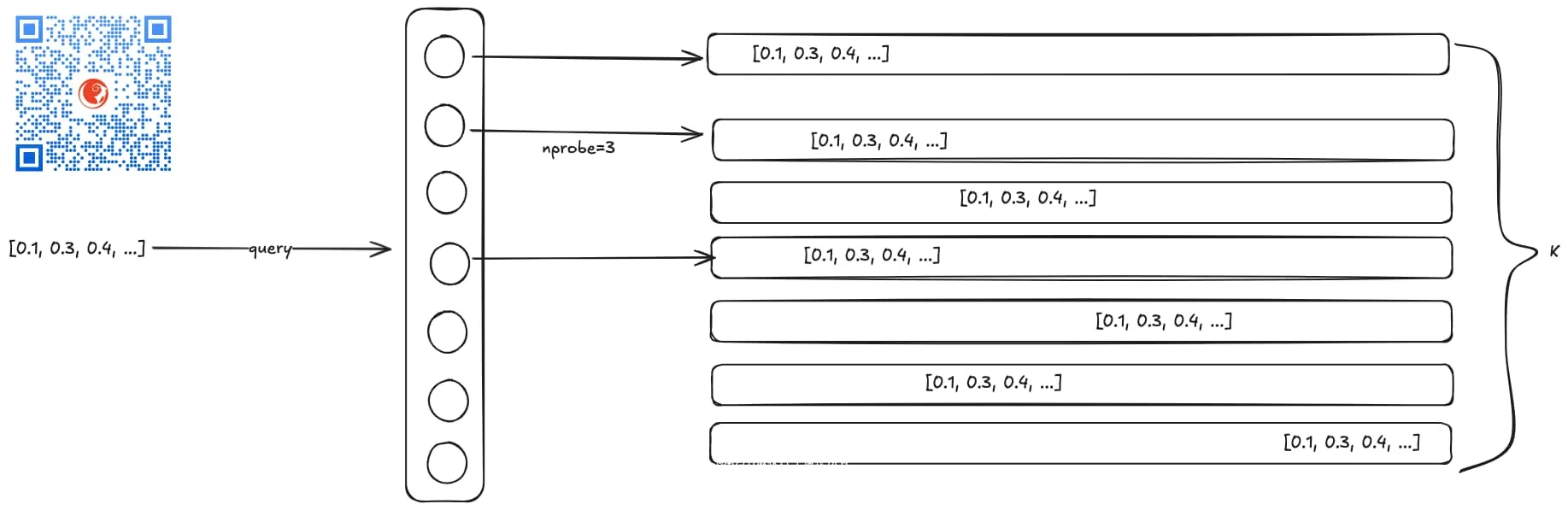 查询的过程是这样的,来一个查询向量,我们还是拿它跟k个质心先做距离计算,取n个最近的,这个n学名叫nprobe,然后在这n个桶里分别进行遍历(俗称暴力搜索,brute-force search), 然后再把搜索结果合并之后再筛选指定数目的候选向量返回(即topK个向量)。