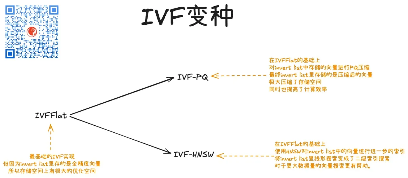 - IVF-HNSW,HNSW也是一种向量索引,KVectors向量数据库有支持,IVF-HNSW就是在IVF的基础上,再对每个inverted list里的向量进行HNSW索引,从而在第二阶段的检索过程中进一步提升检索效率。对于极大数量量来说,这个方式很有效。inverted list很小的时候,则没有必要。