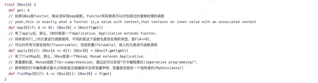- 函数的参数或者返回结果有一个封装为了“盒子”类型,或者参数和范围结果两者都封装为了“盒子”类型; 对于这种情况,为了避免频繁的嵌套和解包,一般会定义 flatMap 操作,flatMap 的作用就是把所有盒子的盒子中的数据都展开成一层,而不是盒子套盒子。 (而且,flatMap 这个名字我觉得起的也不好,其实它的操作是先 map 然后再 flatten,跟名字是反过来的)